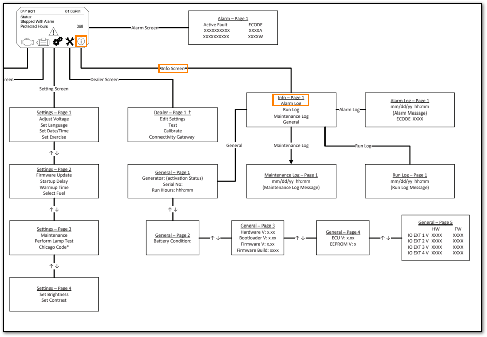 Note: A navigation map for the controller is provided below for reference. A complete navigation map is located in the generator's owner's manual. See Where can I find a user manual or other documentation for my home standby generator?