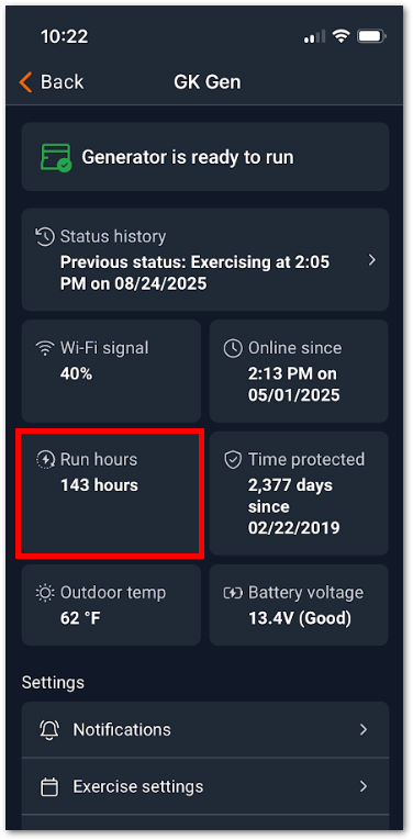 Note: For Next Generation Series generators, generator run hours can only be viewed in the Mobile Link app, on the Mobile Link website, or in the Field Pro app.