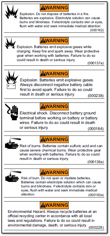 - Protective Clothing: Wear long sleeves and pants to protect your skin from acid spills. If electrolytes contact your skin, wash it off immediately with water.